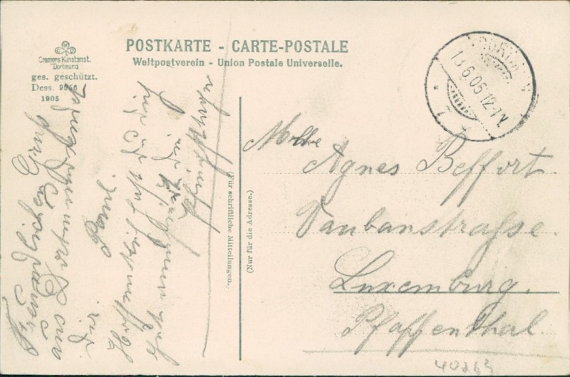 Alte Ansichtskarte aus Dortmund, gelaufen am 13.06.1905 von Dortmund nach Luxemburg.