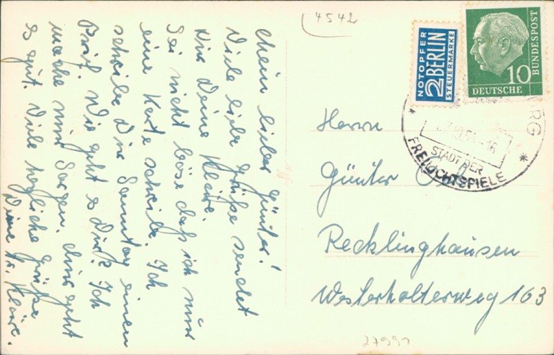 Alte Ansichtskarte aus Tecklenburg, gelaufen am 07.10.1954 von Tecklenburg nach Recklinghausen.