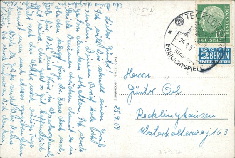 Alte Ansichtskarte aus Tecklenburg, gelaufen am 25.09.1954 von Tecklenburg nach Recklinghausen.