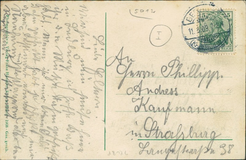 Alte Ansichtskarte aus Bedburg, gelaufen am 11.08.1909 von Bedburg nach Straßburg.