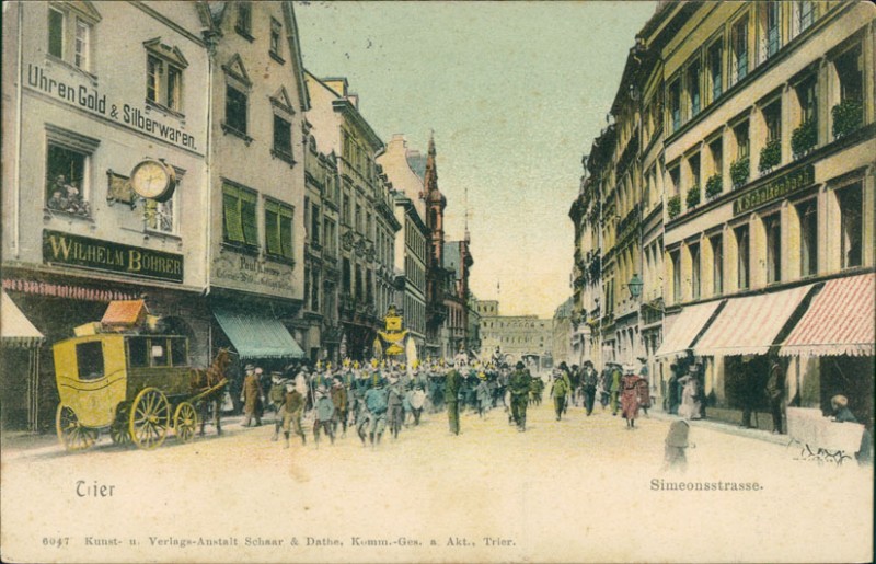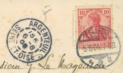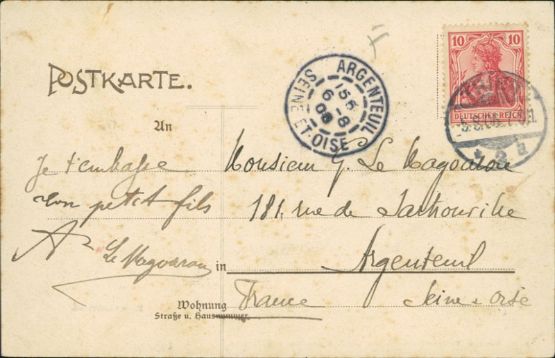 Alte Ansichtskarte aus Trier, gelaufen am 05.08.1906 von Trier nach Argenteuil. Ankunft in Argenteuil am 06.08.1906.