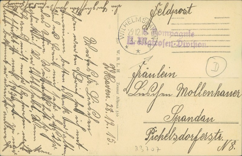 Alte Ansichtskarte, gelaufen am 29.12.1915 von Wilhelmshaven nach Spandau.