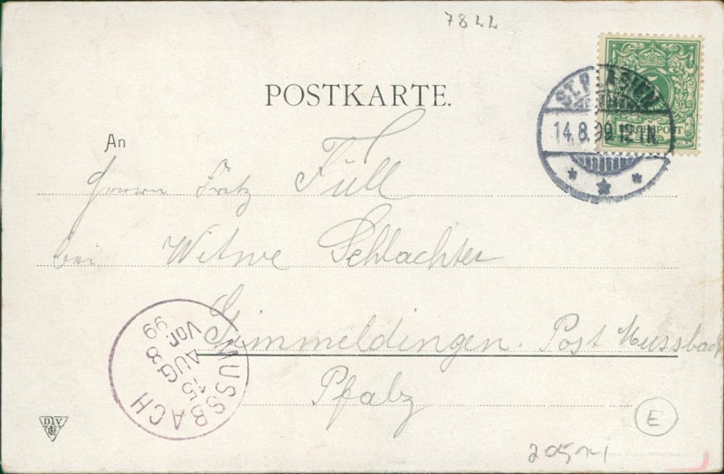 Alte Ansichtskarte aus St. Blasien, gelaufen am 14.08.1899 von St. Blasien nach Gimmeldingen Post Nussbach. Ankunft in Gimmeldingen Post Nussbach am 15.08.1899.