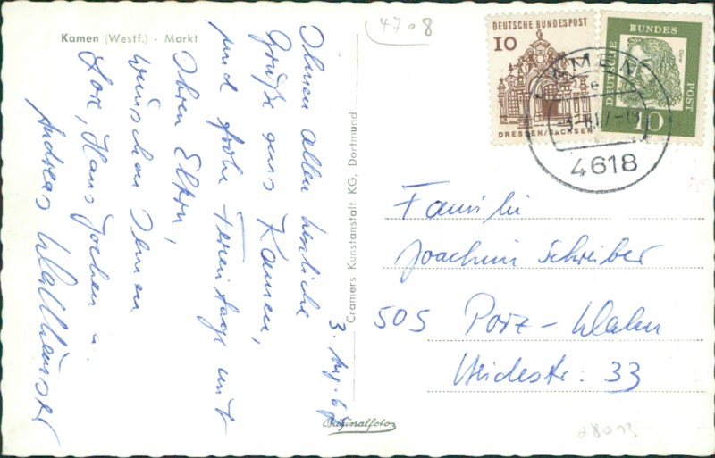 Alte Ansichtskarte aus Kamen, gelaufen am 03.08.1967 von Kamen nach Porz-Wahn.