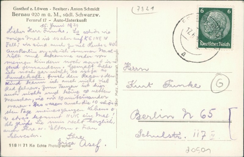 Alte Ansichtskarte aus Bernau im Schwarzwald, gelaufen am 17.06.1939.