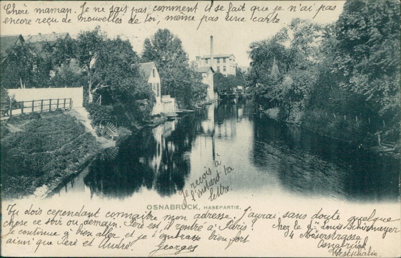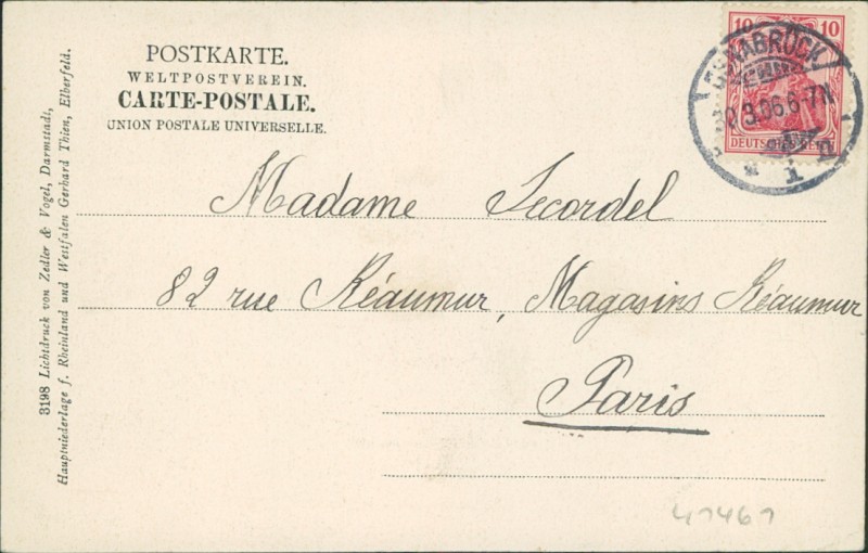 Alte Ansichtskarte aus Osnabrück, gelaufen am 30.03.1906 von Osnabrück nach Paris.