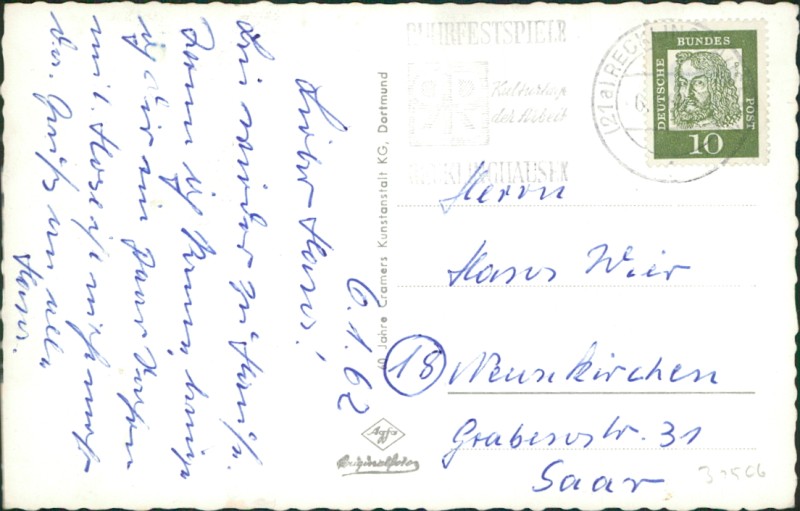 Alte Ansichtskarte aus Recklinghausen, gelaufen am 06.01.1962 von Recklinghausen nach Neunkirchen Saar.