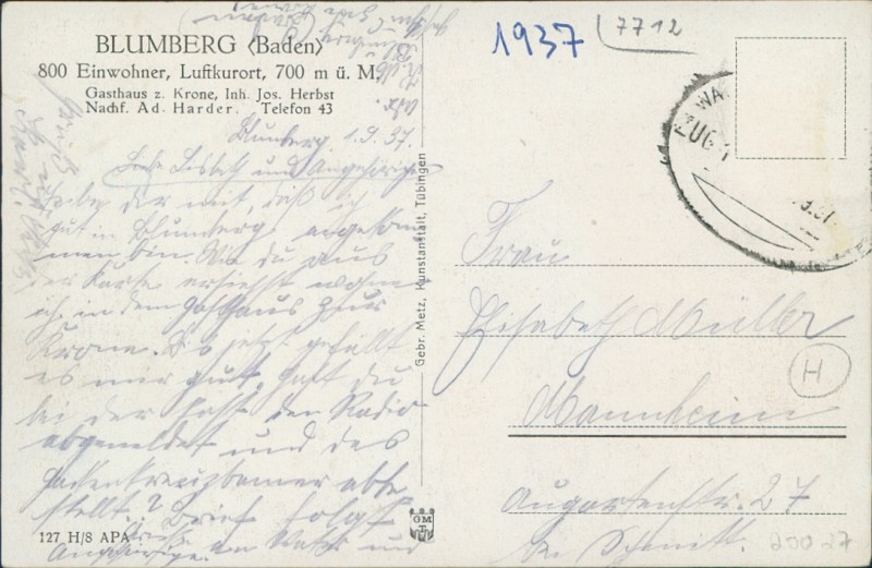 Alte Ansichtskarte aus Blumberg, gelaufen am 01.09.1937.