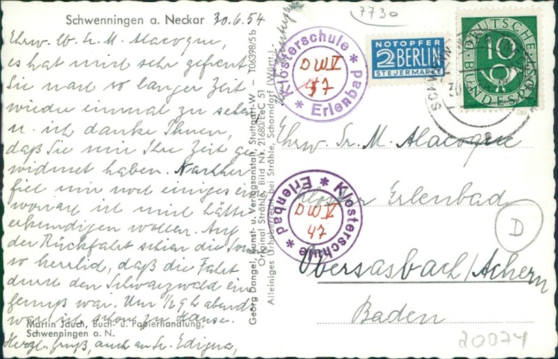 Alte Ansichtskarte aus Villingen-Schwenningen, gelaufen am 30.06.1954 von Schwenningen nach Obersasbach/Acern.