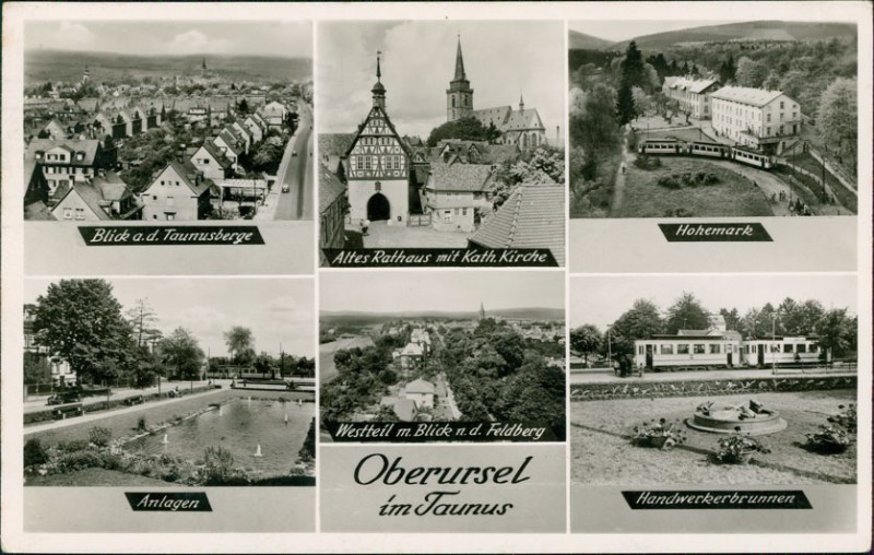 Blick a. d. Taunusberge, Altes Rathaus mit Kath. Kirche, Hohemark, Anlagen, Westteil m. Blick n. d. Feldberg, Handverkerbrunnen