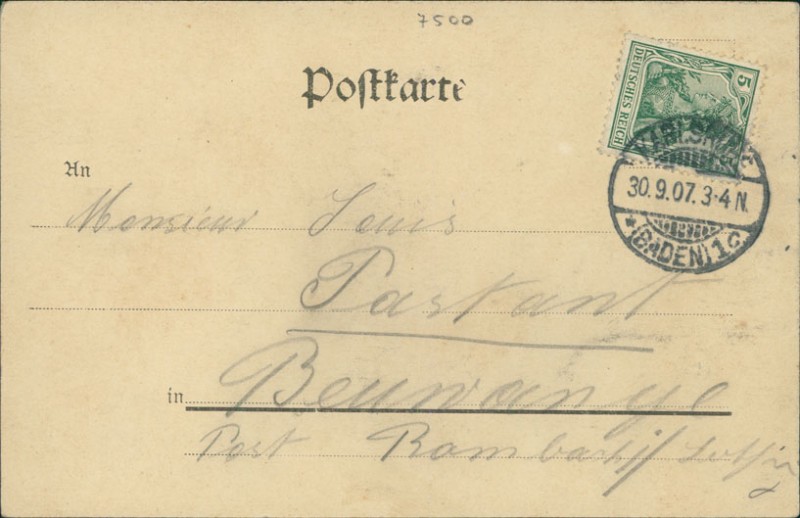 Alte Ansichtskarte aus Karlsruhe, gelaufen am 30.09.1907.