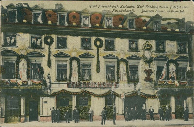 Hotel Friedrichshof, Karl Friedrichstrasse (nächst dem Hauptbahnhof). Brauerei Sinner, Grünwinkel