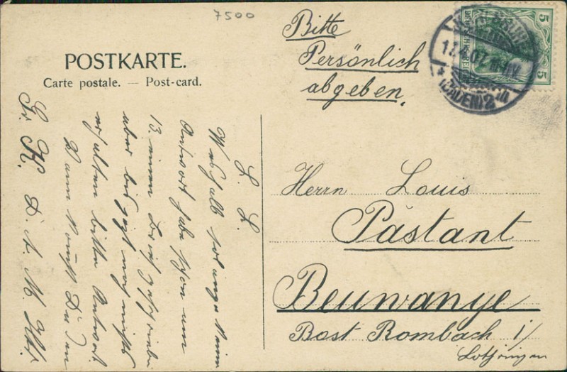 Alte Ansichtskarte aus Karlsruhe, gelaufen am 12.04.1907 von Karlsruhe (Baden) nach Beuvange.