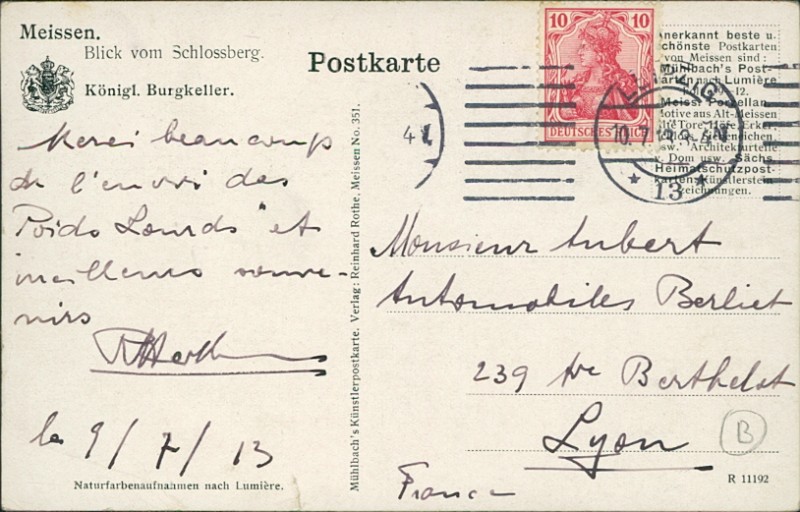 Alte Ansichtskarte aus Meißen, gelaufen am 10.07.1913 von Leipzig nach Lyon (Frankreich).