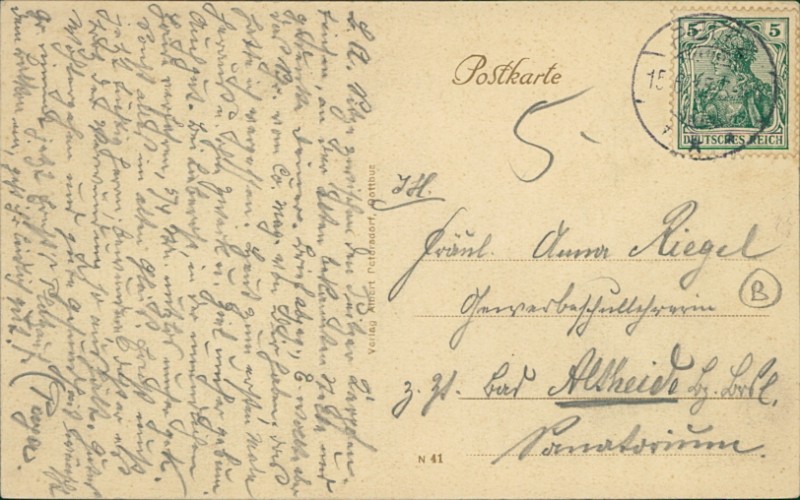 Alte Ansichtskarte aus Peitz, gelaufen am 15.06.1915 von Peitz nach Bad Altheide.