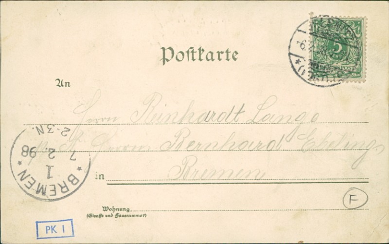Alte Ansichtskarte aus Oelsnitz, gelaufen am 06.02.1898 von Oelsnitz nach Bremen. Ankunft in Bremen am 07.02.1898.
