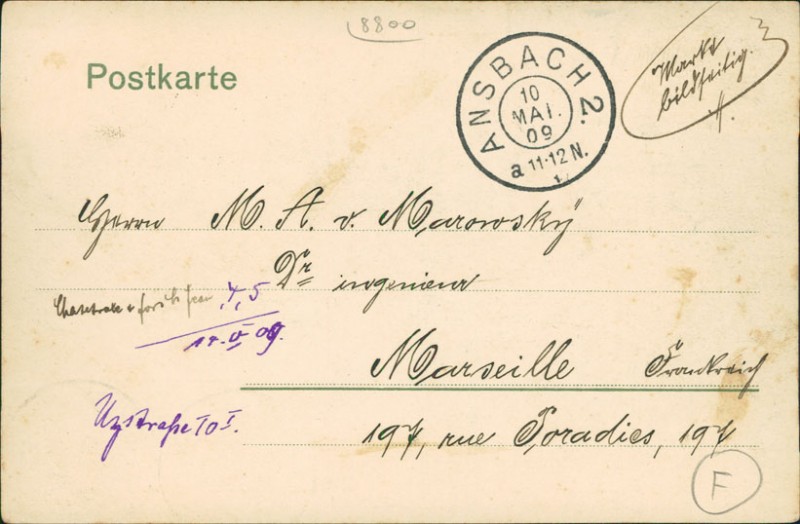 Alte Ansichtskarte aus Ansbach, gelaufen am 10.05.1909 von Ansbach nach Marseille.