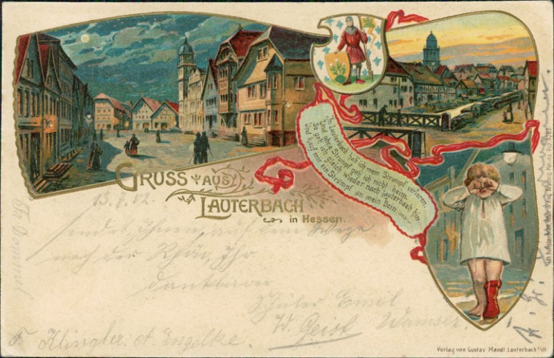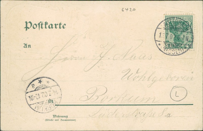 Alte Ansichtskarte aus Lauterbach (Hessen), gelaufen am 13.07.1902 von Lauterbach (Hessen) nach Borkum. Ankunft in Borkum am 14.07.1902.