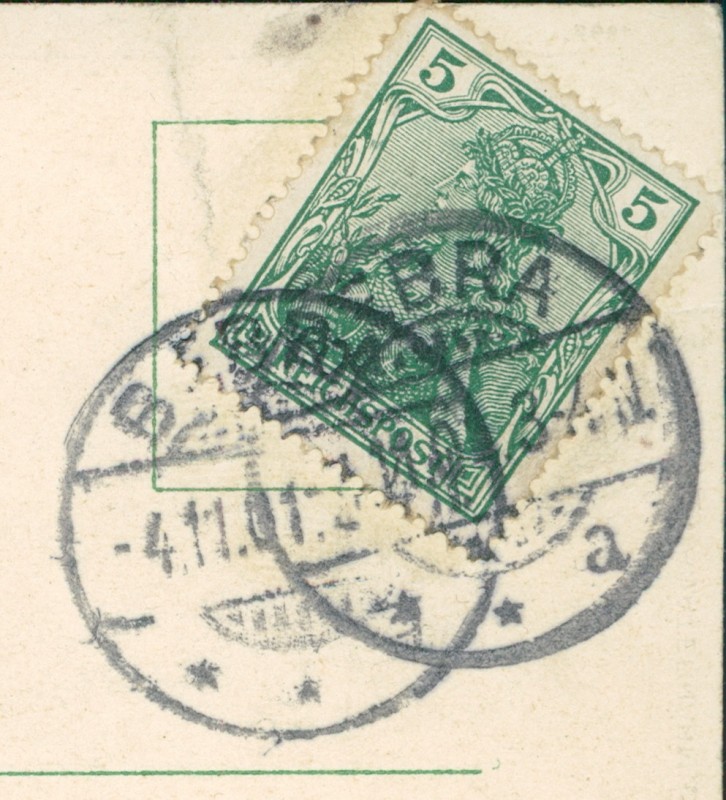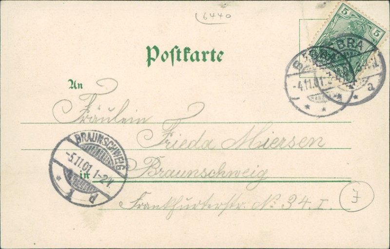 Alte Ansichtskarte aus Bebra, gelaufen am 04.11.1901 von Bebra nach Braunschweig. Ankunft in Braunschweig am 05.11.1901.