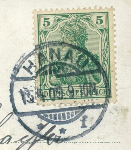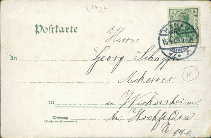 Alte Ansichtskarte aus Hanau, gelaufen am 15.04.1909 von Hanau nach Wickersheim.