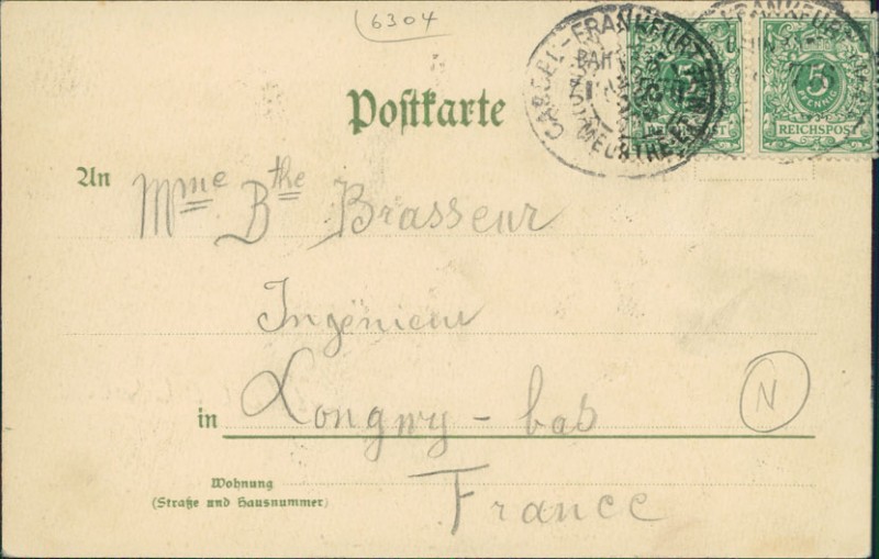 Alte Ansichtskarte aus Lollar, gelaufen am 27.12.1899 von Cassel-Frankfurt (Bahnpost) nach Longwy-Bas.