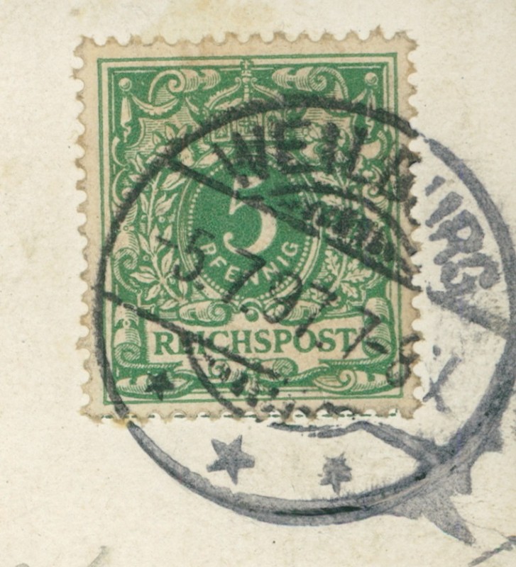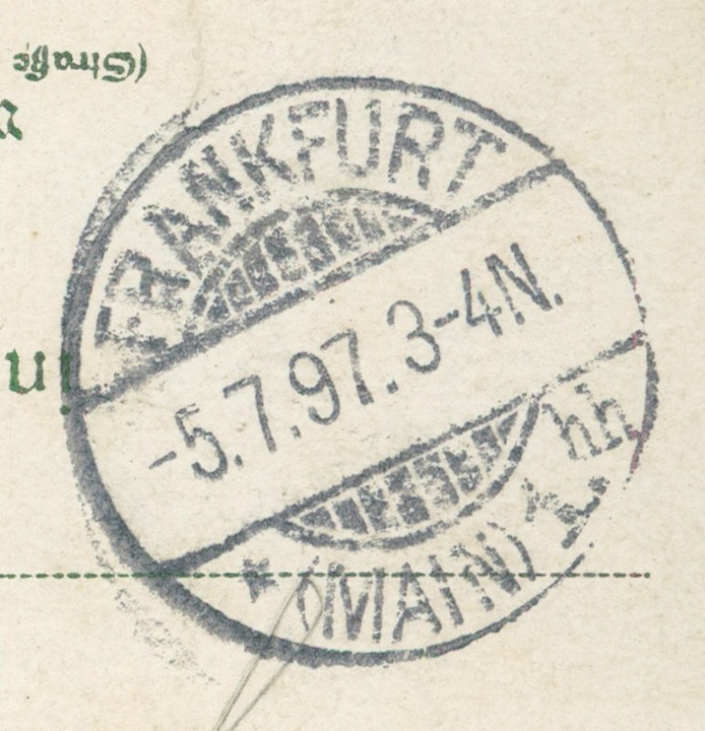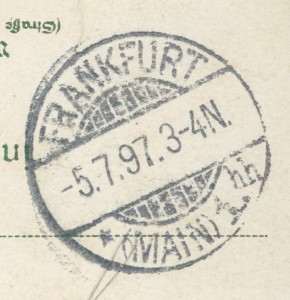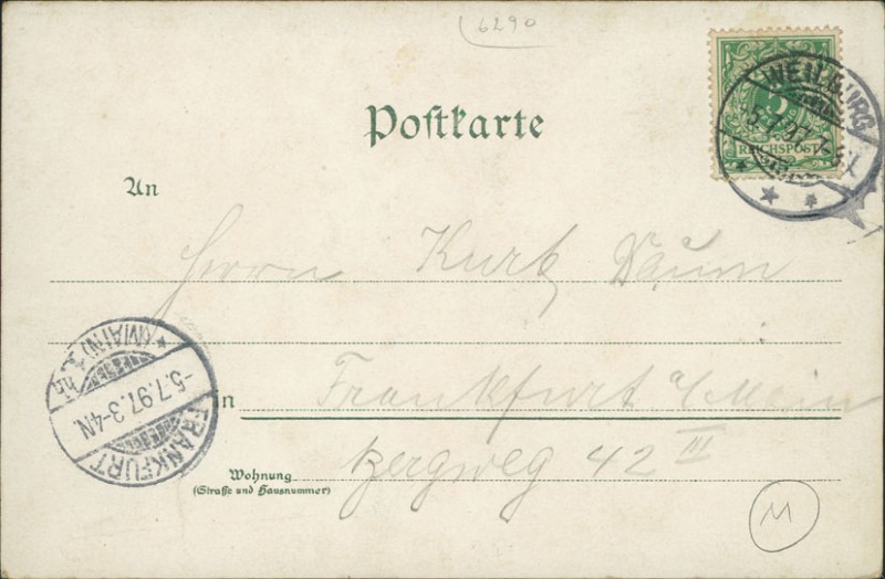 Alte Ansichtskarte aus Weilburg, gelaufen am 05.07.1897 von Weilburg nach Frankfurt (Main). Ankunft in Frankfurt (Main) am 05.07.1897.