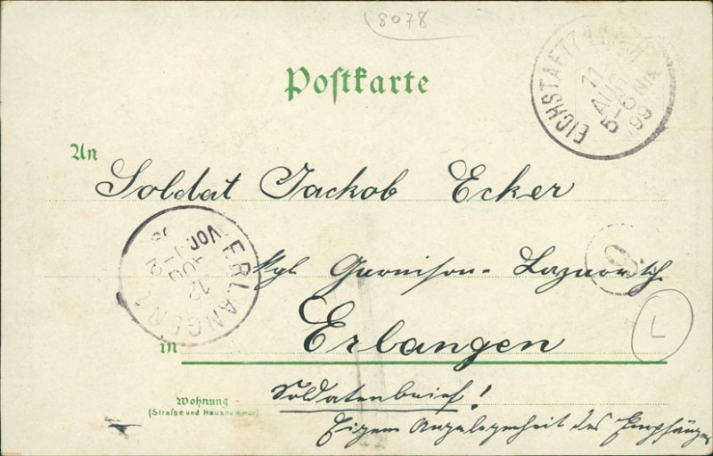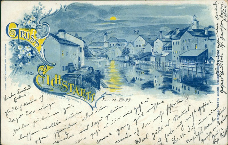Alte Ansichtskarte aus Eichstätt, gelaufen am 11.08.1899 von Eichstaett nach Erlangen. Ankunft in Erlangen am 12.08.1899.