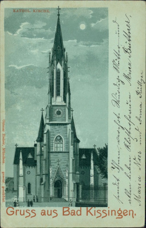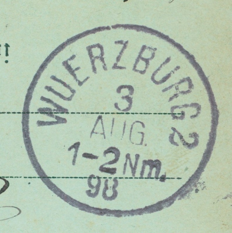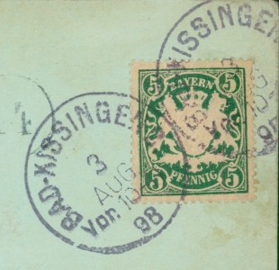 Alte Ansichtskarte aus Bad Kissingen, gelaufen am 03.08.1898 von Bad Kissingen nach Würzburg. Ankunft in Würzburg am 03.08.1898.