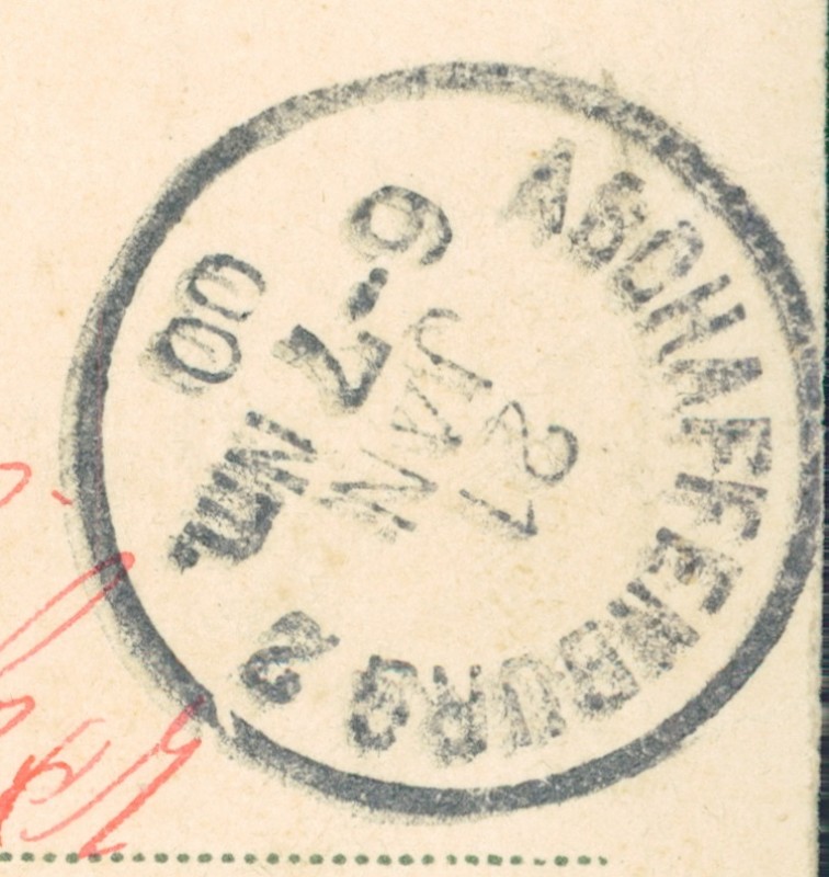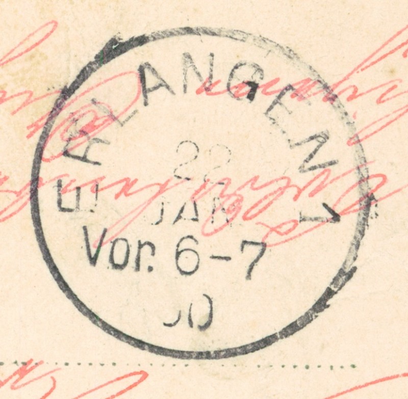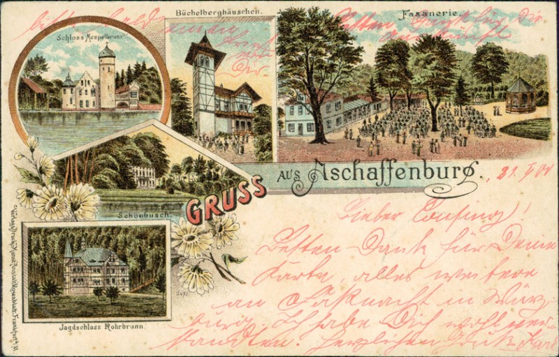 Alte Ansichtskarte aus Aschaffenburg, gelaufen um 0 von Aschaffenburg nach Erlangen. Ankunft in Erlangen am 22.01.1900.