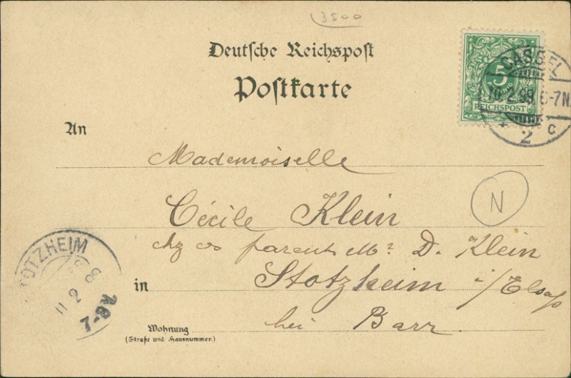 Alte Ansichtskarte aus Kassel, gelaufen am 10.02.1899 von Cassel nach Stotzheim i/Elsass. Ankunft in Stotzheim i/Elsass am 11.02.1899.