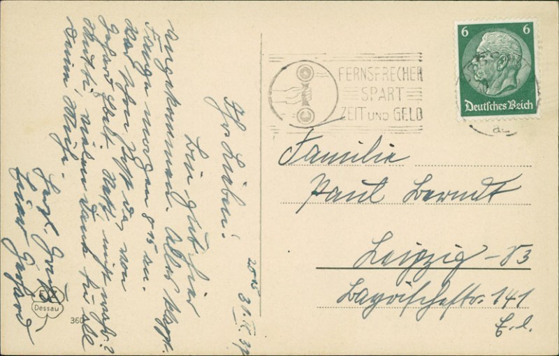 Alte Ansichtskarte aus Dessau-Roßlau, gelaufen am 30.09.1937 von Dessau nach Leipzig.
