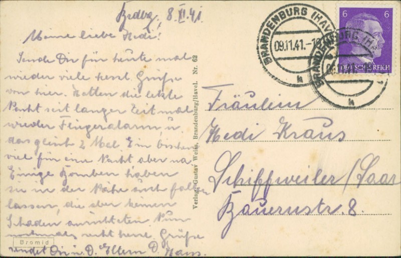Alte Ansichtskarte aus Brandenburg an der Havel, gelaufen am 09.11.1941 von Brandenburg (Havel) nach Schiffweiler/Saar.