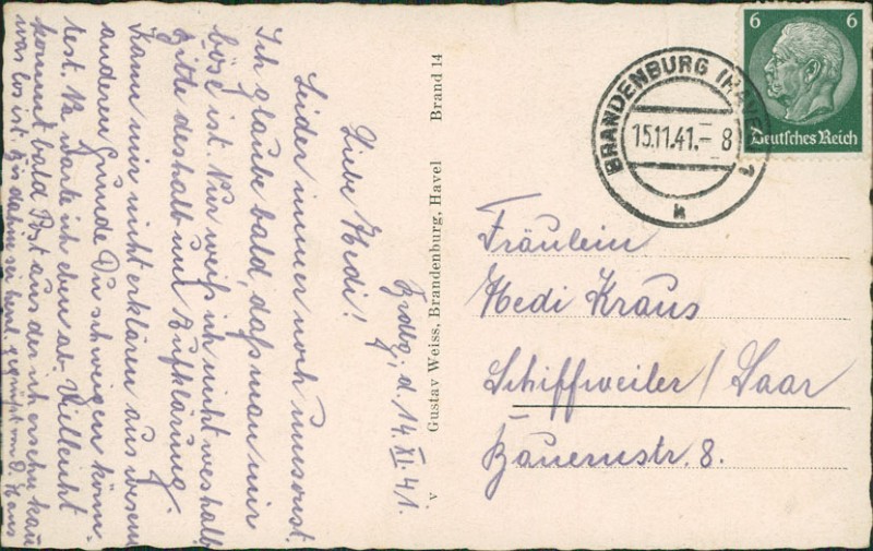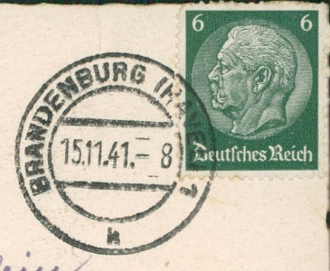 Alte Ansichtskarte aus Brandenburg an der Havel, gelaufen am 15.11.1941 von Brandenburg (Havel) nach Schiffweiler/Saar.