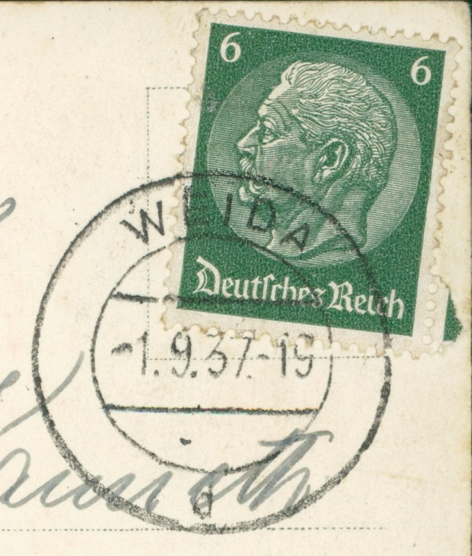 Alte Ansichtskarte aus Weida, gelaufen am 01.09.1937 von Weida nach Ellenberg/Altm.