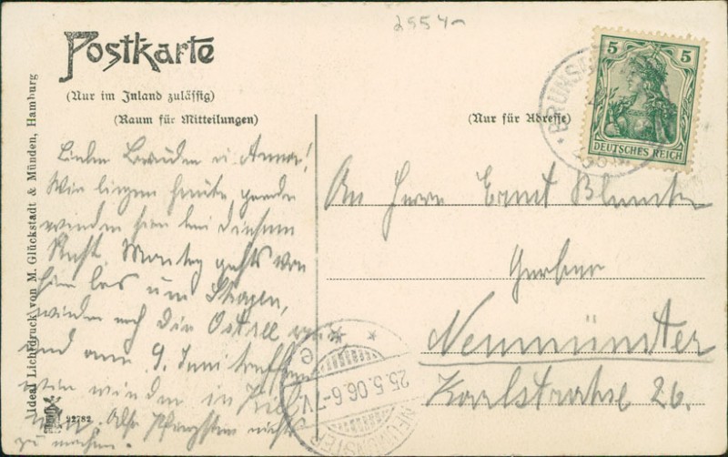 Alte Ansichtskarte aus Brunsbüttelkoog, gelaufen um 1906 von Brunsbüttelkoog nach Neumünster. Ankunft in Neumünster am 25.05.1906.