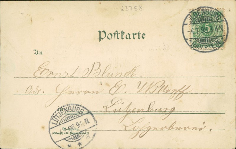 Alte Ansichtskarte aus Oldenburg in Holstein, gelaufen am 04.01.1898 von Oldenburg (Holstein) nach Lütjenburg. Ankunft in Lütjenburg am 04.01.1898.