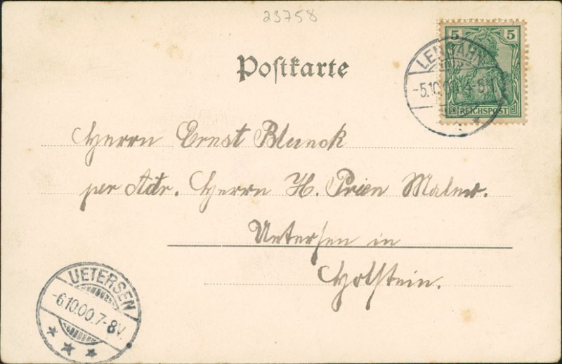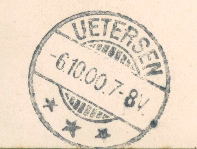 Alte Ansichtskarte aus Wangels-Hansühn, gelaufen am 05.10.1900 von Lenbahn nach Uetersen. Ankunft in Uetersen am 06.10.1900.