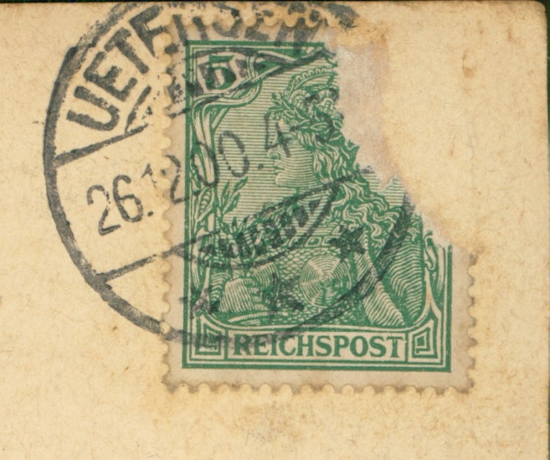 | Erhaltung | Briefmarke z. T. entfernt, größere Druckstelle rechts, Ecken mit Druckstellen vom Album |