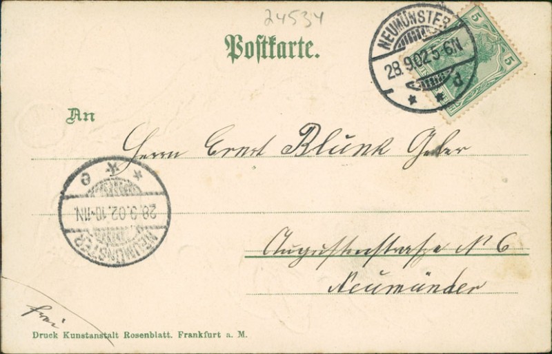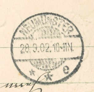 Alte Ansichtskarte aus Neumünster, gelaufen am 28.09.1902 von Neumünster nach Neumünster. Ankunft in Neumünster am 28.09.1902.
