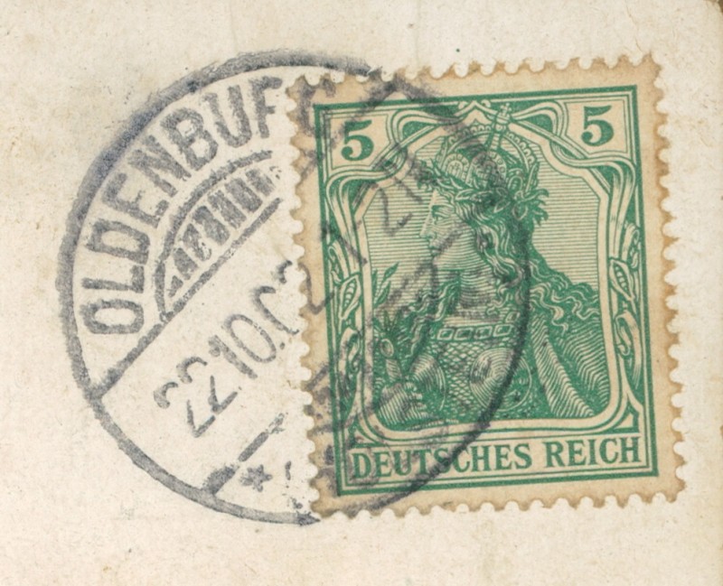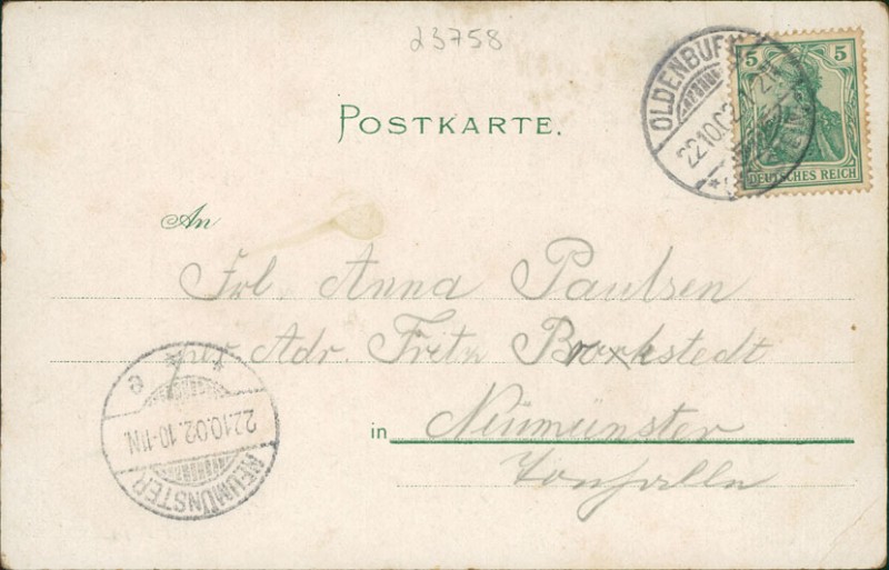 Alte Ansichtskarte aus Oldenburg in Holstein, gelaufen am 22.10.1902 von Oldenburg (Holstein) nach Neumünster. Ankunft in Neumünster am 22.10.1902.