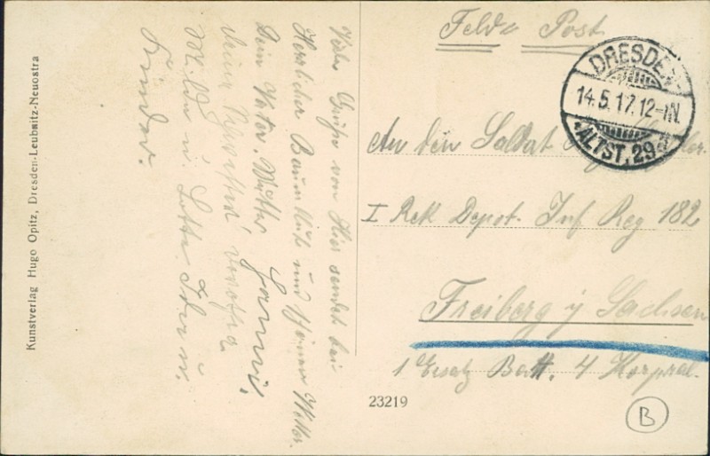 Alte Ansichtskarte aus Dresden, gelaufen am 14.05.1917 von DresdenAltst. 29 nach Freiberg i. Sachsen.