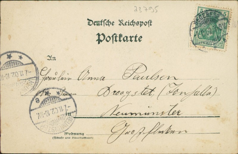 Alte Ansichtskarte aus Bad Segeberg, gelaufen am 07.11.1902 von Segeberg nach Neumünster. Ankunft in Neumünster am 07.11.1902.