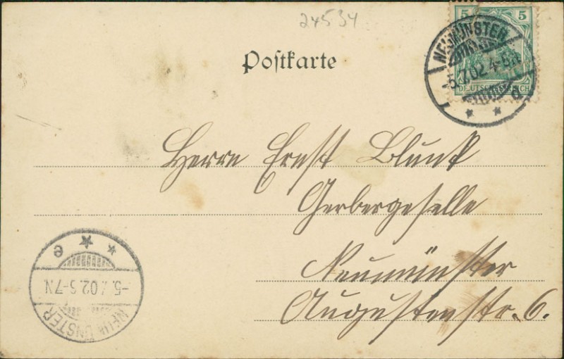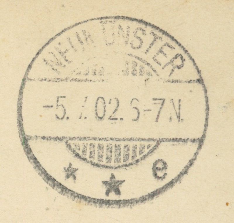 Alte Ansichtskarte aus Neumünster, gelaufen am 05.07.1902 von Neumünster nach Neumünster. Ankunft in Neumünster am 05.07.1902.