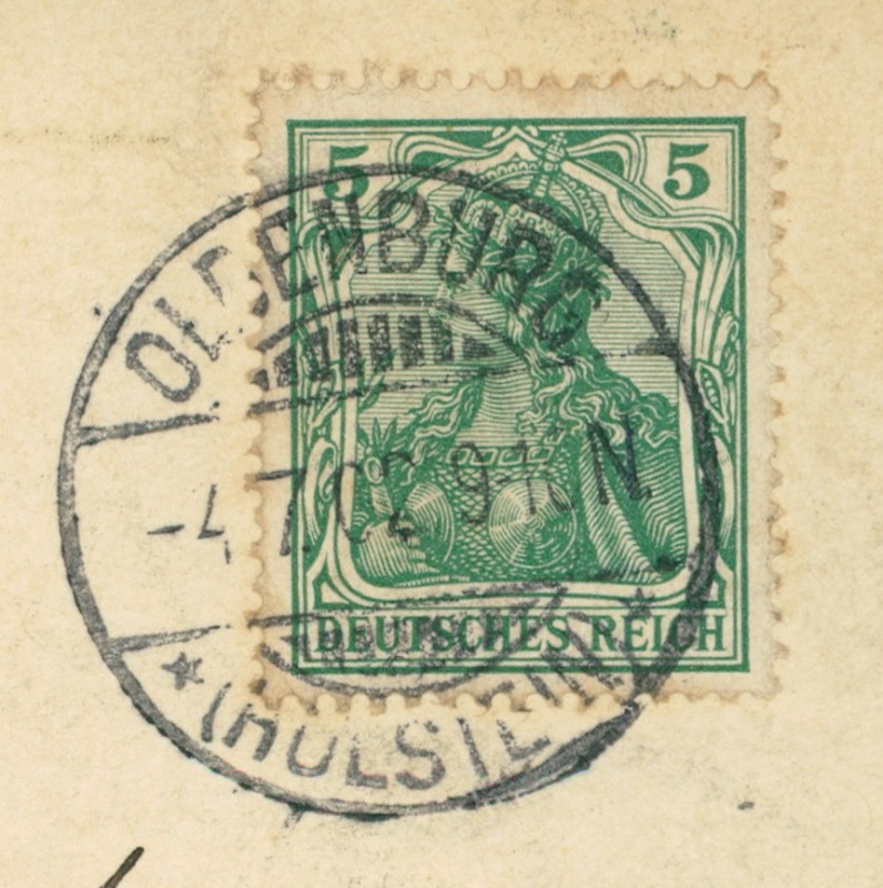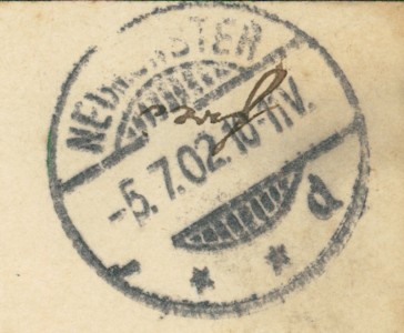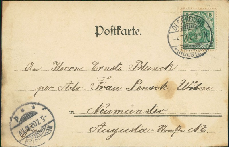 Alte Ansichtskarte, gelaufen am 04.07.1902 von Oldenburg (Holstein) nach Neumünster. Ankunft in Neumünster am 05.07.1902.