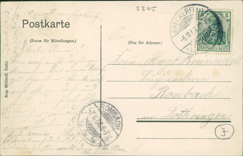 Alte Ansichtskarte aus Breckerfeld, gelaufen am 06.11.1906 von Breckerfeld nach Rombach. Ankunft in Rombach am 07.11.1906.