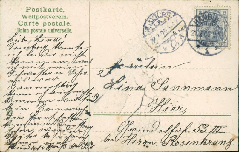 Alte Ansichtskarte, gelaufen am 21.02.1906 von Hamburg nach Hamburg. Ankunft in Hamburg am 22.02.1906.