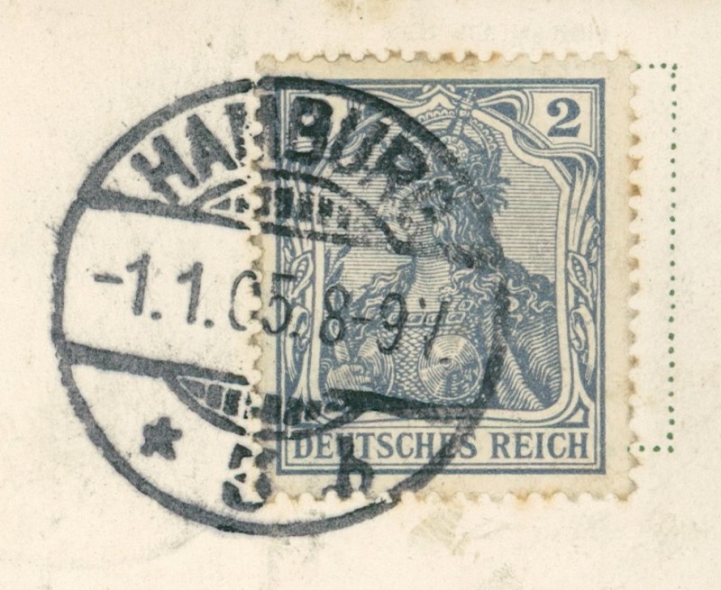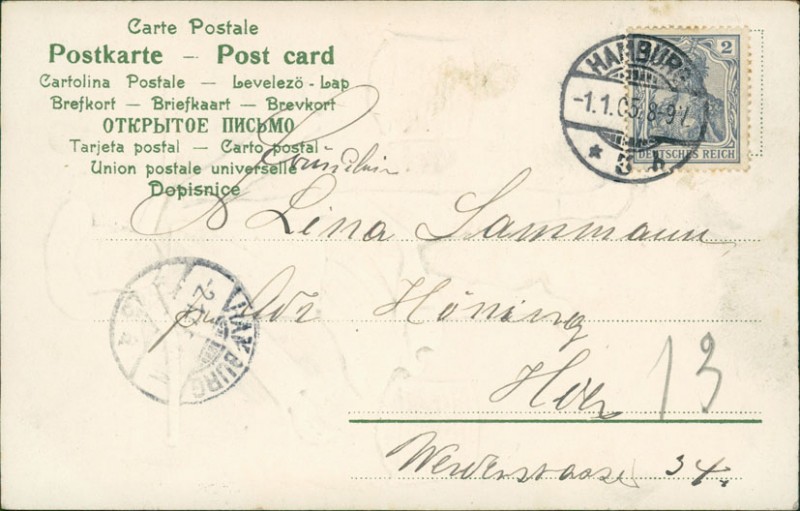 Alte Ansichtskarte, gelaufen am 01.01.1905 von Hamburg nach Hamburg. Ankunft in Hamburg am 02.01.1905.