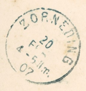 Alte Ansichtskarte aus Zorneding-Ingelsberg, gelaufen am 20.02.1907 von München nach Zorneding. Ankunft in Zorneding am 20.02.1907.