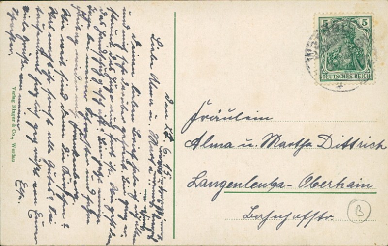 Alte Ansichtskarte aus Werdau, gelaufen am 27.06.1915 von Werdau nach Langenleuba-Oberhain.
