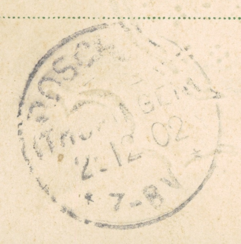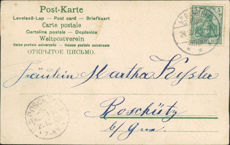 Alte Ansichtskarte, gelaufen am 24.12.1902 von St. Gangloff nach Roschütz. Ankunft in Roschütz am 25.12.1902.